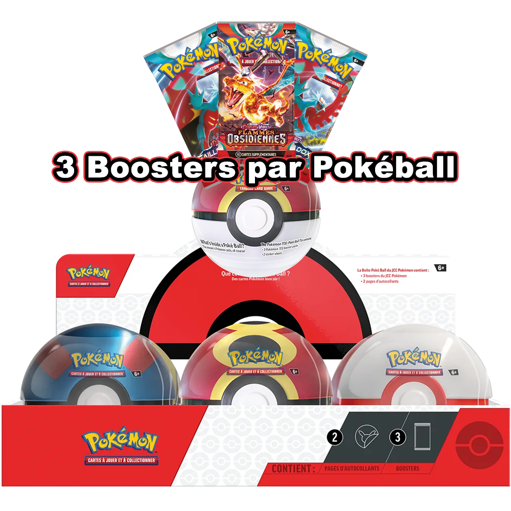 Chaque Pokéball contient 3 boosters du Jeu de Cartes à Collectionner Pokémon, issus de séries populaires du bloc Écarlate et Violet. Ouvrez-les pour découvrir de nouvelles cartes et compléter votre deck.