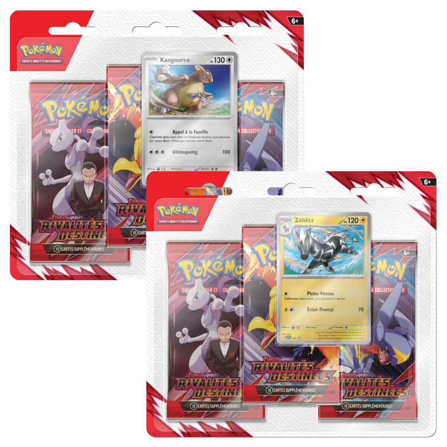 Ce Tripack contient 3 boosters de l’extension + 1 carte promo exclusive (Kangourex OU Zéblitz) + 1 carte à code pour le JCC en ligne.
